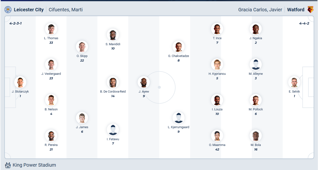 Watford hiện tại không còn là đội bóng mạnh có thể cạnh tranh cho chiếc vé thăng hạng của Championship nữa, mùa giải trước họ chỉ đứng thứ 14 còn mùa giải năm nay đội bóng của HLV cũng chỉ có được vị trí thứ 10 sau vòng 22. Cơ hội lọt vào top 6 đương nhiên là vẫn còn, để nuôi hy vọng đó thì các cầu thủ Watford cần tiếp tục chơi ổn định như 4 vòng đấu vừa qua (2 thắng, 2 hòa) hoặc thậm chí còn phải chơi tốt hơn thế. Chính vì vậy khi đến làm khách trên sân của Leicester thì Watford muốn có chiến thắng, nhưng trước đối thủ không hề yếu thì khả năng một trận hòa cũng là kết quả chấp nhận được.